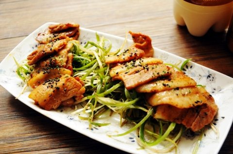 한 번 삶아 기름을 쫙 뺀 삼겹살에 데리야키 소스를 발라 한 번 초벌구이 한 요리임