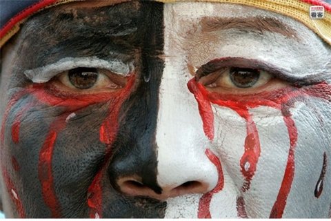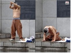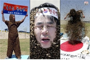 2006년 5월 2일, 한국의 서울. 한 양봉가가 187000마리의 그의 몸을 덮는 벌(독도의 면적 187000제곱 미터를 상징)을 이용해 일본의 독도에 대한 영유권 주장에 반대하며 일본 국기위에 서있다. 한일 사이에는 한국에서는 독도, 일본에서는 다케시마라고 불리는 작은 섬에 대해 영토분쟁이 있다. 양국은 모두 영유권을 주장하고, 한국인들은 이 문제에 대해 시위를 한다.