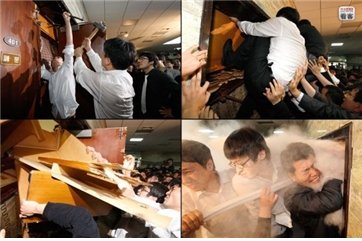 2008년 12월 18일, 서울에서 미국과 자유 무역 협정을 체결하려는 국회의 계획에 반대한 한국의 야당이 의회 위원회 문을 망치로 부수고 들어갔다. 국회의원들이 가구로 출입구를 막고, 소화기로 대치를 하는 바람에 아수라장이 벌어졌다.