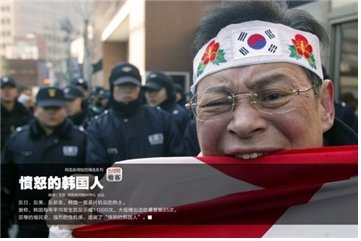 비록 한국과 일본이 모두 미국의 동맹군이지만, 한일 관계는 식민지 시대 때문에 팽팽하다. 1910년 8월, 일본은 대한제국의 황제에게 한반도를 공식적으로 합병하는 한일합병조약에 서명할 것을 강요했다. 사진은 2001년 8월 13일 서울. 서울에서는 20살의 청년들이 고이즈미 준이치로 전 일본 총리의 야스쿠니 신사 참배에 항의하며 대중 앞에서 그들의 손가락을 잘랐다.