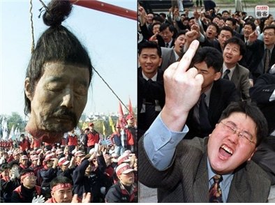 2006년 8월 15일, 서울의 일본 대사관 앞. 한 전직 스파이가 고이즈미 준이치로의 그해 6번째 연이은 야수쿠니 신사 참배에 반대하며 고이즈미 준이치로(모형)의 목을 베고 있다.
