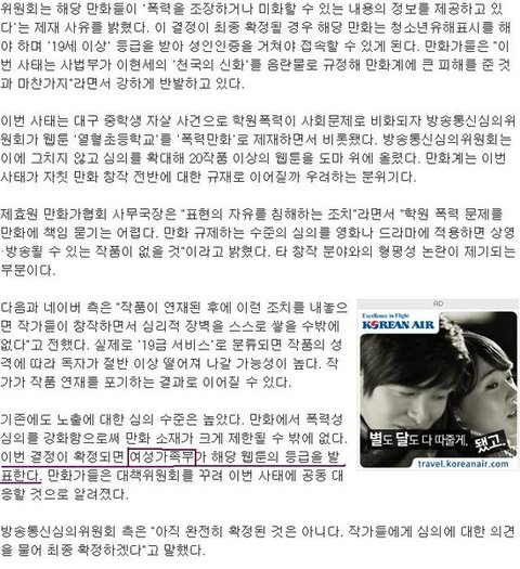 확실히 몇몇 웹툰은 청소년이 보기에 부적합하다고 생각되는 것도 있지만, 과연 이것이 정말 폭력과 연계되어 유해매체가 되어야할 조항인지, 학교폭력이 이런것에서 오는 것인지, 다시 한 번 생각해보셨으면 합니다.