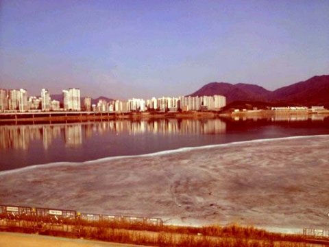 한강인데 오른쪽은 강이 얼어있는 모습이고 왼쪽은 조금씩 녹아 물이 되어있는 모습임.