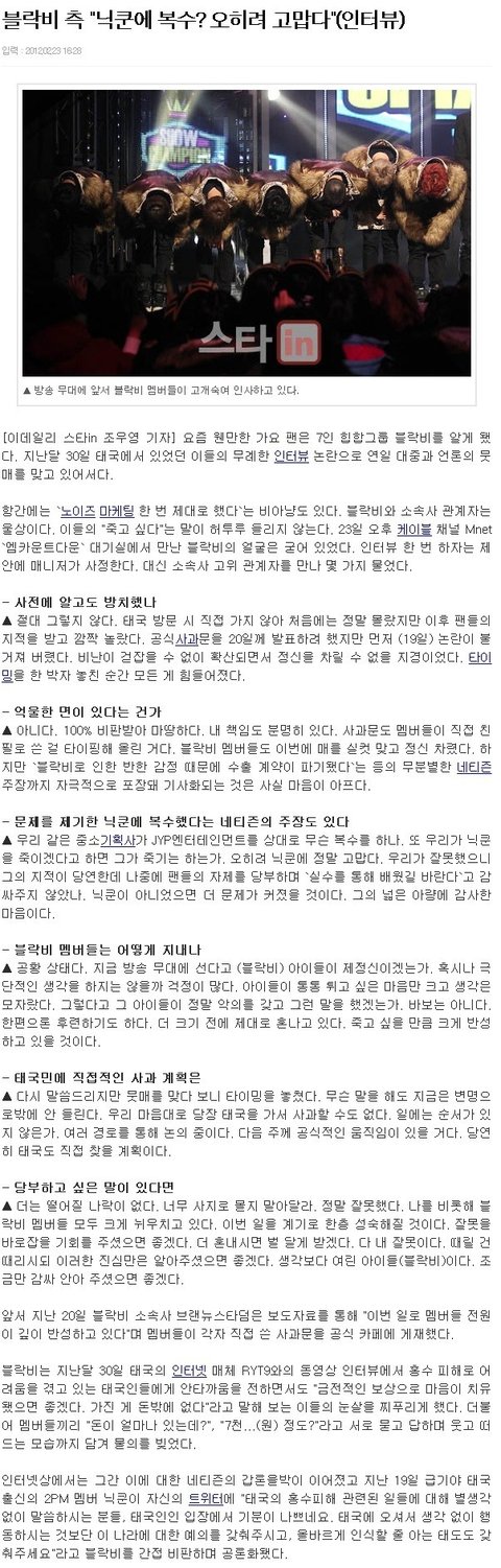 블락비 태국 인터뷰라는 기사가 떳을때는 되게 빨리 이슈화?가 되었는데 사과한거는 이슈화되지 않는 듯.. 추천좀 누르고 가주세요ㅠㅠ 블락비가 사과하고 반성하고 있다는 걸 많은 사람들이 알아줬음 좋겠어요ㅠㅠ