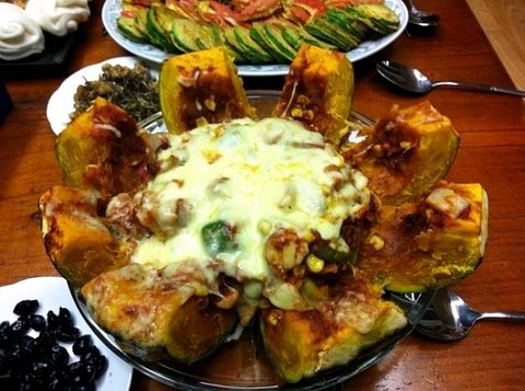단호박 속을 파고 그 안에 데친 새우, 오징어, 콘, 피망, 양파 등등을 넣고