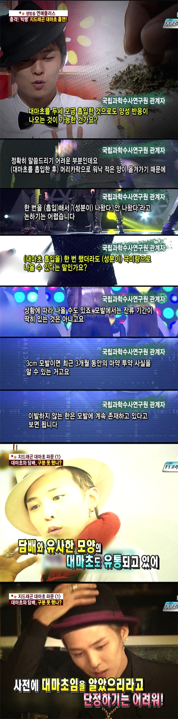 KBS 연예가중계는 대마초 관련 지드래곤의 해명을 제시한 뒤, 이것에 의혹을 제기하기 위해서 방송이 인용한 것은 개인들의 의견일 뿐