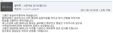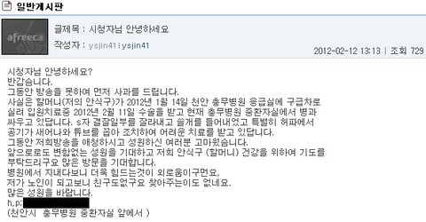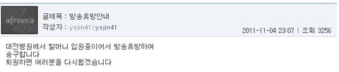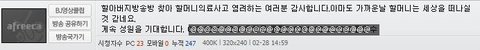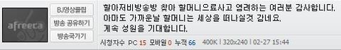 ▶아래에 할아버지의 방송국(아프리카 tv에서 할아버지만의 홈페이지)에 글을 올리신 걸 캡쳐한 화면입니다.