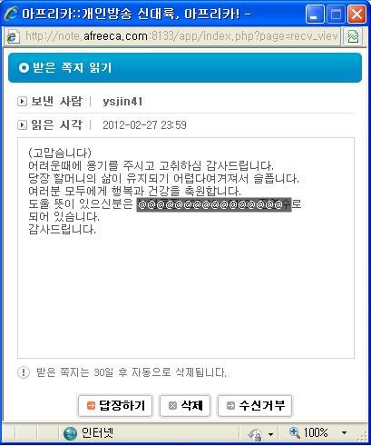 현재 아프리카tv 진영수 할아버지 방송국 사이트 게시판에 계좌번호 글을 남긴상태입니다.