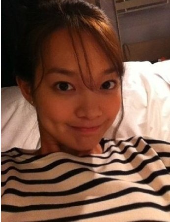 신민아는 침대 셀까에서도 세인트제임스 티셔츠를 입고 있는 모습이