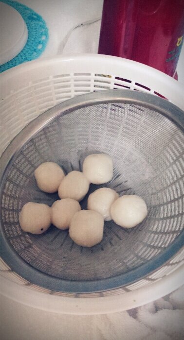 6. 물기를 뺀 경단을 키친타올에 물을적신 접시에 올려놓구 고물을 뭍힐차례!!