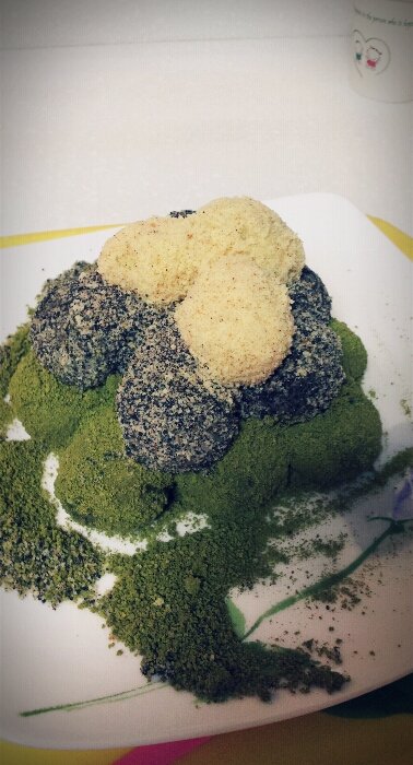 ☜노란색고물(카스테라), 초록색고물(카스테라+녹차가루),