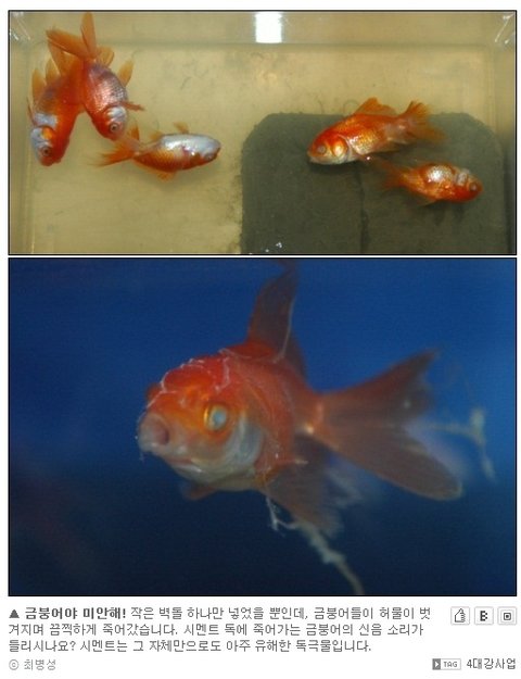 결론적으로, 금붕어가 비늘이 녹아들어가면서 죽은 이유는, 시멘트가 강 염기성이라 그런 것임. 시멘트의 원료가 되는 석회의 성질을 알고 있는 이과생이라면 충분히 공감 가능한 이야기임.