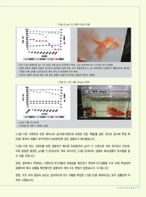 알다시피, 이타이이타이 병이나 미나마타 병 같은 중금속 관련 질병들은 수개월 내지 수년에 걸쳐 몸속에 중금속이 축적되어 나타나는 병임. 금붕어 몇 마리 수조에 담가 놓고 시멘트 벽돌 넣는다고 수 십분 만에 중금속 중독되는 거 아님. 기본적인 상식이 없으면 이런 허무맹랑한 짓을 할 수가 있음.