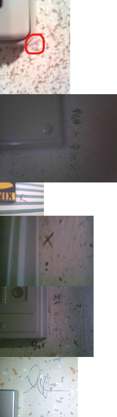 낙서인듯한 표시 그리고 스티커(특히 빨간색 동그라미 스티커)