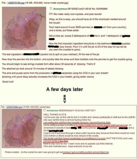 크리스탈 실험 생존자 후기내용= 아ㅎㅎ 됸나고마워 ㅎㅋㅋㅎㅎㅋㅋㅋㅋㅋㅋㅋㅋ 내가 거의 두달동안인가 여기 디씨 맨날오고 내가 항상 이런거저런거 하는거 좋아해서 여기 디씨에 올려진거 앵간한건 다 해보는데 이번에는 내가 존ㅋ나ㅋ 뒈질뻔했어 나 지금 이글쓰는거 병원에서 쓰는거야. 왜?ㅋ 나 뒤질뻔했다고 씨X 어떤 X같은새끼가 집에서도 쉽게구할수있는것들로 크리스탈만드는방법을 올렸드라? 내가 맞게 기억하는게 맞다면 @@@, 井井井井井, $$$$$ 등등이가 필요했었음... 그거 다 만든다음 어지러울때까지 빨대로 조카 숨을불어야지 이산화탄소가 더생겨서 크리스탈 색이 이쁘게 나온대드라. 근데 의사가 하는말이 내몸속에서 독가스인지 뭔지가 발견됬데 (뭐여씨X.. ㅡㅡ) 그리고 내가 몇일동안 의식불명이었다드라. 나는 그래서 병원에 일주일더있어야하고.. 엄빠는 인터넷 끊어버렸네....? 조카 고맙다 XX새끼들아. 니들모두가 뒤지길 진심으로 바랄께 ㅎㅎ 저사진 그 글이랑 관련된거야. 저 크리스탈이 그자식 말만믿고 내가 만들려고했던 크리스탈인데, 크리스탈은 개뿔 니X 뒤질뻔했네.