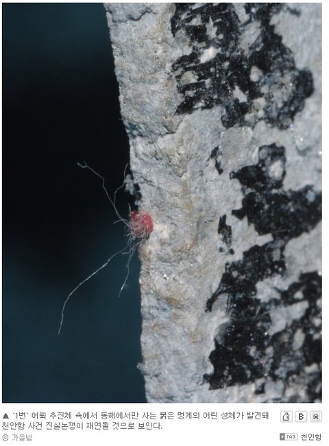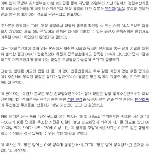 <'1번' 어뢰추진체에 동해산 붉은 멍게? "붉은 멍게와는 색깔과 모양 전혀 달라"> - 데일리안 2011.03.24 김현