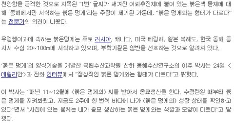 인용한 기사의 마지막 줄이 압권인데, 이주 박사는 국내에 유일한 '붉은 멍게' 권위자로서 붉은 멍게 양식을 연구하고 있는 진짜 전문가이시다. 그런 이주 박사가 붉은 멍게 양식은 아직 성공한 적이 없다고 했는데 저 '붉은 멍게 양식업자 a씨'는 과연 누구이며, 저 붉은 물질은 무엇인가?