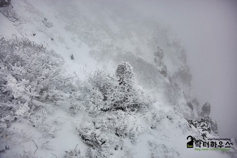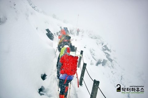 평소에도 실족하기 좋은 코스인데 사진만 봐도 위험하기 짝이 없네요. 그렇다고 쳐도 눈보라가 지나는 찰나에 수줍은 듯 드러내는 산세의 풍광은 가히 절경이었습니다.