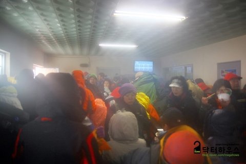얼마나 걸었을까 저 아래로 윗세오름 대피소가 나타났습니다. 사막을 건너 만나는 오아시스가 이런 느낌일까요. 불안하게 움츠러들었던 마음이 일순간 풀렸습니다. 좁은 실내에 사람으로 북적이며 수증기로 가득했습니다. 그런데 시끌시끌한 실내가 오히려 사람냄새로 느껴져 좋았습니다.