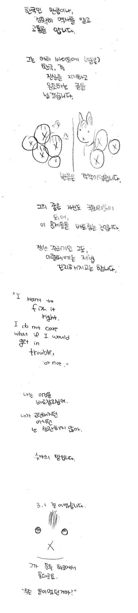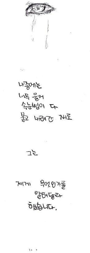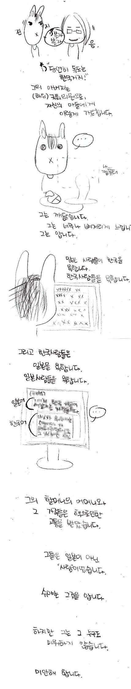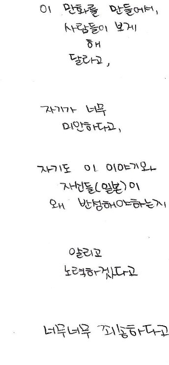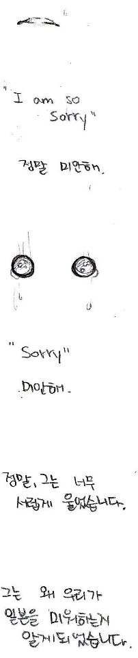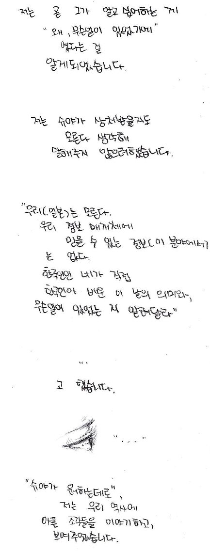 너무 슬펐습니다. 혹시 너무 많은 사람이 그렇게 생각하고 있지는 않겠지....라고 곱씹지만, 이 한개의 댓글이, 그래요 사실 감사하게 올려주신 칠백여개의 댓글들을 하나하나 보며 뿌듯해 하다가, "이거 뻥 아님"이라는 한마디가 너무 잔혹하게 느껴지는건 어쩔수 없습니다. 혹시 가능하시다면, 저는 그분들께 전하고 싶습니다. 저는 제 친구에게 이 글을 보여주지 않을겁니다. 어디까지 인증해야 그들이 마음을 열고 제 친구를 저를 사과하려는 사람들을 믿어줄까요...? 제가 말씀드렸듯, 예상했습니다. 슈야도 예샹했습니다. 그럼에도 불구하고 올린 만화입니다. 그 뜻은.....정말 동정플레이라니요.... 슈야에게, 방과후에 남아있는 저에게 직접 찾아와 자신의 어머니에게 전화를 해서 허락을 맏고 그렇게 울고 간 제 친구는 사람을 속였다는 이야기를 들을 일을 하지 않은 그에게, 무슨 말이세요..... 일본사람이라고 가장할 것 없이 그가 일본 사람인데, 그리고 진짜 그 잔혹한 시절을 보고, 사진으로까지 찍혀있는 선명한 과거를 보고 너무 괴로워서 몸을 한껏 웅크리고 울다간 제 친구한테 속였다니요... 제가 거짓을 만들고 있다니요... 무슨 말이세요.....무슨말이세요.....