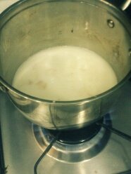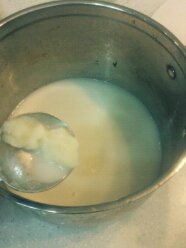 생크림과 쌂은 물을 섞으시고 열심히 감자 으깬거를 섞어줌니당~~(많이 넣으시면 으깬 감자가 느낌이~)
