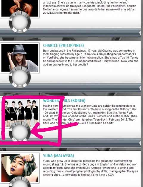 원더걸스가 2012 Kids' Choice Awards 에 아시안 엑터 부분 후보에 올랐습니다.