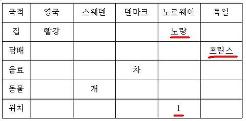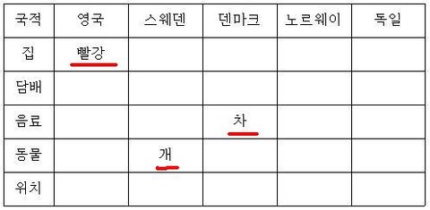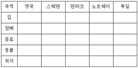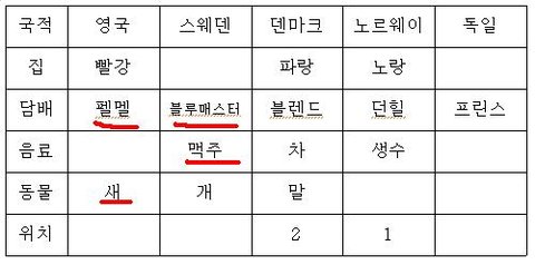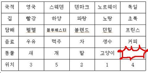 영국네는 빨간집이 있으니 독일네가 초록집에 커피를 마시게 되어있음^^ 하하