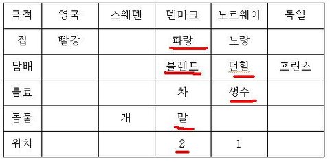 2) 5번에서는 초록집에사는 사람은 커피를 마신다 했으니 차를 마시는 덴마크 사람은 아니라는 것을 알수 있음