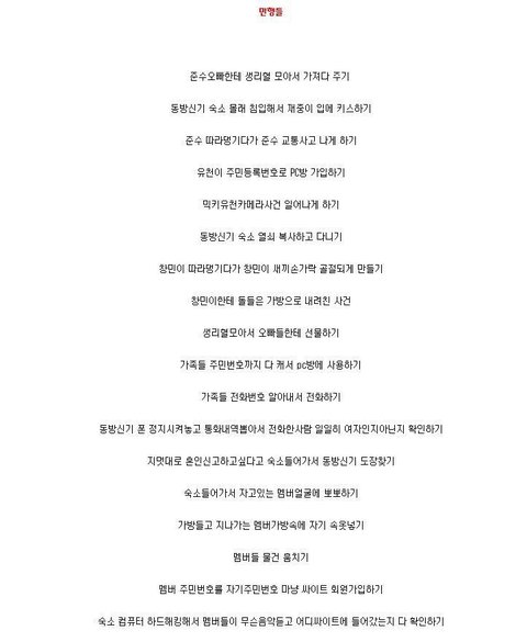위에 만행글에도 있다시피 숙소 문을 따고 들어가 멤버 입술에 뽀뽀하고 나오는 사건도 존재함.