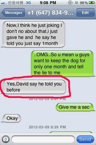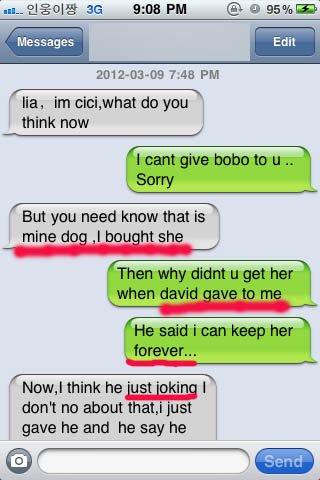 나는 당연히 개를 줄수 없다고 했고 데이빗이 분명 내게 개를 아예 준다고 말했다고 햇음
