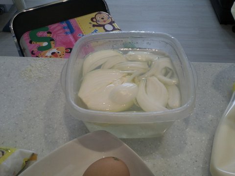 양파의 매운맛!! 그 맛을 잡아주기위해 소금물에 담궈서 준비~!