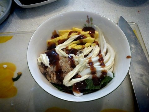 재료: 참치통조림 1캔, 밥, 계란, 마요네즈, 빨가루, 깻잎 양파 당근 소금 후추