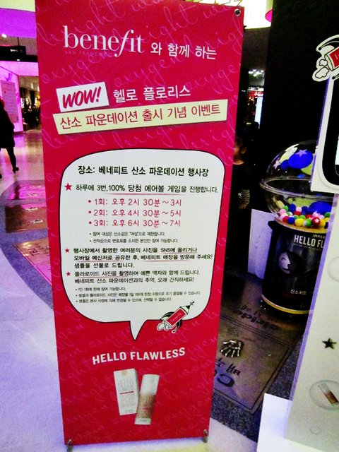 있더라구요. 베네피트 헬로 플로리스 산소 파운데이션 행사장을 배경으로 사진찍어 SNS에 올리거나 메신저로 공유한 뒤 매장을 방문하면 샘플을 증정하는 이벤트와 폴라로이드 사진 촬영, 포춘 메시지, 그리고 100% 당첨 에어볼 게임까지 아주 다양한 행사가 마련되어 있었습니다. 행사 내용은 이따 다시 자세히 소개할게요.