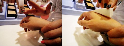 행사 시간까지 시간이 많이 남아 행사장 한 쪽에 마련된 산소 파운데이션 테스터 장소에서 신제품을 테스트 해보았어요. 매장 언니가 산소 파운데이션 기능에 대해 설명해주면서 손등에 테스트를 진행해주었는데요, 요 제품 요거요거 아주 물건이드라구요