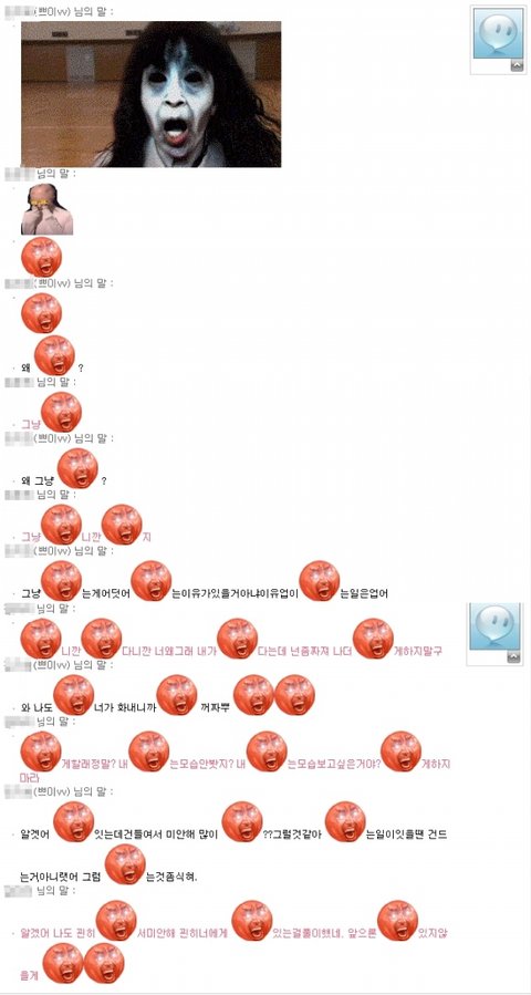 친구 (쁘이vv) 님의 말 :귀신 저 님의 말 :ㅜㅜ화나 친구 (쁘이vv) 님의 말 :화나 왜 화나 ? 저 님의 말 :그냥화나 친구 (쁘이vv) 님의 말 :왜 그냥 화나 ? 저 님의 말 :그냥화나니깐화나지 친구 (쁘이vv) 님의 말 :그냥화나는게어딧어화나는이유가있을거아냐이유업이화나는일은업어 저 님의 말 :화나니깐화나다니깐 너왜그래 내가화나다는데 넌좀짜져 나더화나게하지말구 친구 (쁘이vv) 님의 말 :와 나도화나너가 화내니까화나 꺼짜뿌 화나화나 저 님의 말 :화나게할래정말? 내화나는모습안봣지? 내화나는모습보고싶은거야?화나게하지마라 친구(쁘이vv) 님의 말 :알겟어 화나잇는데건들여서 미안해 많이 화나??그럴것같아 화나는일이잇을땐 건드는거아니랫어 그럼 화나는것좀식혀. 저 님의 말 :알겠어 나도 괸히화나서미안해 괸히너에게 화나있는걸풀이했네. 앞으론화나있지않을게 화나화나