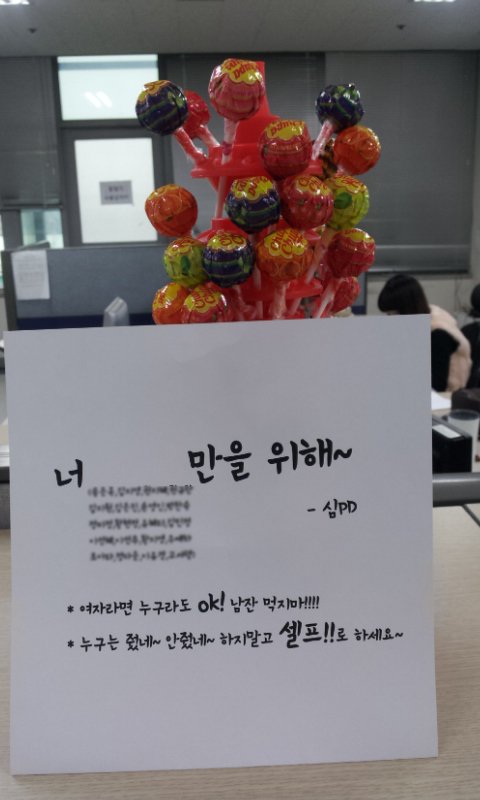 저 멀리 회사 입구 쪽에 춥파춥스 한통이 사탕가득 꽂힌채로 있었습니다.