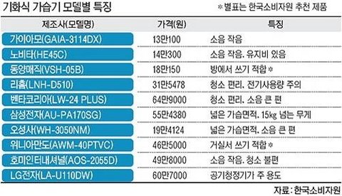소비자원 관계자는 “기화식가습기 성능이 반드시 가격과 비례하지는 않는다”며 “가격, 가습량, 유지비용 등을 종합적으로 고려해 사용 목적에 적합한 제품을 선택하는 것이 좋다”고 말했다.