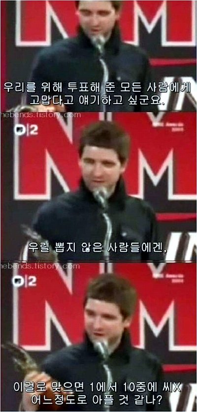 리암 갤러거 음원을 다운받는건 내가 예전에 해왔던 것과 비슷하지. 라디오에 내가 좋아하는 음악이 나오면 그걸 테이프로 녹음해서 듣곤 하는 거 말이야. 난 별로 그런거 신경 안써.  다만 난 징징대는 모든 멍청한 락스타들을 혐오할 뿐이지. 그렇게 네들거 다운받는 다운로더들은 얼간이 같은 너희들의 음악에 적어도 관심은 가져주고 있잖아. 이제 뭔 말 하는지 알겠냐?  너희들은 그거에 성기나 감사해야 하는거라고. 대체 왜 그리 질질 짜는거지?  당신들은 성기나 큰집을 5채씩이나 갖고 있잖아.  그러니까 좀 닥치라고.   [출처] 표절왕 박진영과 오아시스 리암 갤러거의 불법 음원에 대한 인식차이|작성자 미스터리