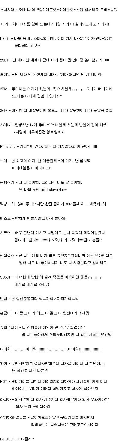엠블랙 - 왜 나를 떠나가 다시 내 곁에 와 근데 친구놈이 내 여자를 뺏어갔넹 하 이 씹새끼 넌 전쟁이야 인피니트 - 니년은 날 못벗어남 죽어서도 못벗어나지만 난 좀 상큼함 형 커요? or 좋아하는여자가있는데 남친이바람피네 나한테와 내꺼하자 넌나한테서 벗어날수없어 그러니 다시돌아와 난끝낸적없어 B.A.P - 난 전사다 시발 그러니까 비밀연애하자 블락비 - 그대로 멈춰 그리고 가서 전해 난리났다고ㅡㅡ B1A4 - OKㅋ넌 내여자임 ㅇㅇ 근데 미안 못된것만 배워서 그래도 넌 내 뷰티풀 타겟임 그리고 넌 내 사랑이야 근데 Baby I'm So Sorry 난 널 잊을꺼임