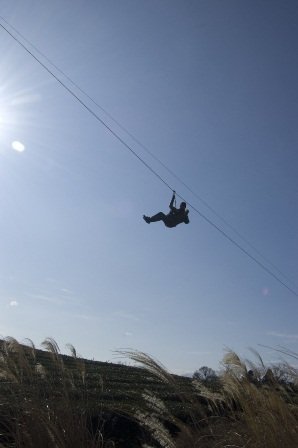 와이어 한줄에 의지해 하늘을 비행하는 짚라인은 미국이나 유럽·호주 등지에서는 이미 일반화되어 있는 차세대 레포츠입니다. 짚라인이란 양편의 나무 또는 지주대 사이로 튼튼한 와이어를 설치 후 탑승자와 연결된 트롤리(도르레)를 와이어에 걸고 빠른속도로 반대편으로 마치 타잔처럼 줄을 타고 숲과 계곡 사이를 날아서 이동하는 레포츠의 통칭을 명합니다. 와이어를 타고 이동할 때 트롤리와 와이어의 마찰음이 '지잎~(zip~)'과 비슷하게 들린다 하여 '짚라인'이라 불리고 있답니다.
