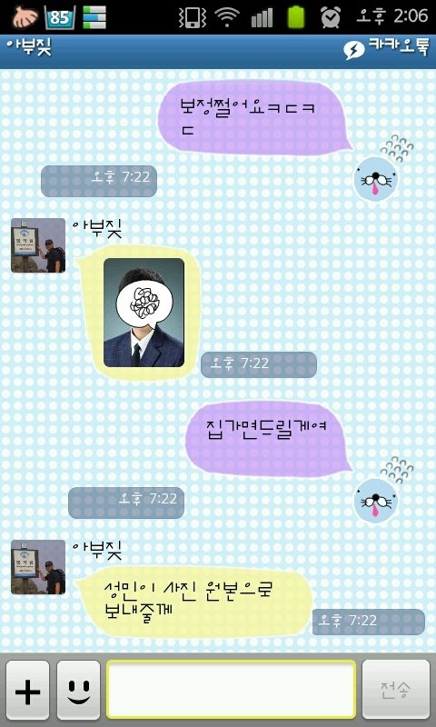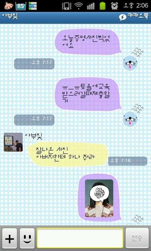 그러고 난 울 아부지랑 카톡하면서 오늘 무슨일 있었나 얘기하다가 슬쩍 증명사진 찍었다구 말했더니