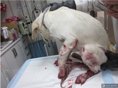 왼쪽 앞다리 부러짐(인대 모두 끊어짐 가죽 아주심하게벗겨짐, 사진전송가능)