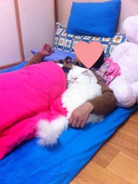 베개는 고양이가 베고, 사람은 인형 베고.