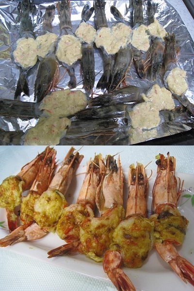 갑자기 오신 손님들 안주 - 마요네즈,카레가루 섞어서 새우속살에 발라 오븐에 구워줌