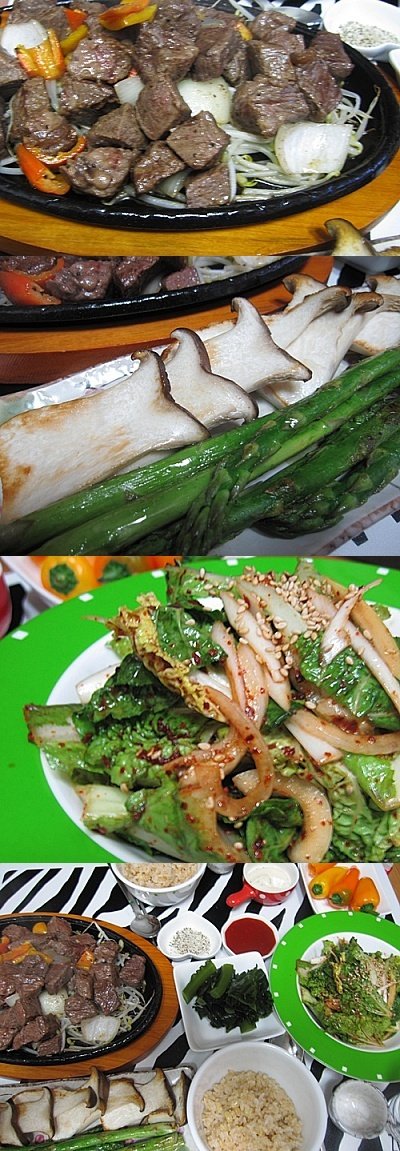 봄동무침과 새송이버섯, 아스파라거스 굽고, 물미역데친것도 함께...