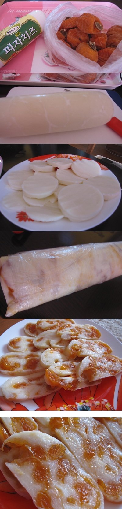 피자치즈에 곶감넣고 전자렌지에 돌려서 돌돌 말아서 굳혀주면 곶감치즈 완성!