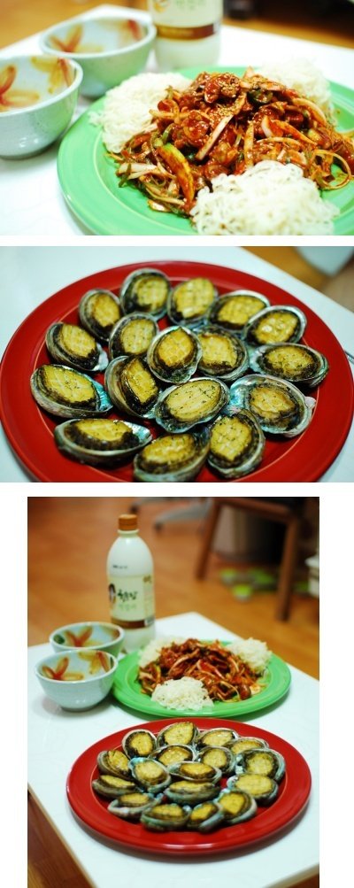전복버터구이와 골뱅이무침. 소면이 없어서 라면으로......^^