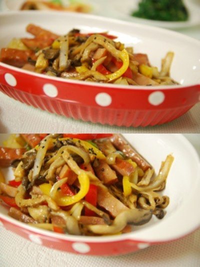 냉장고 정리겸 버섯+야채+햄 썰어서 굴소스 넣고 볶아주기