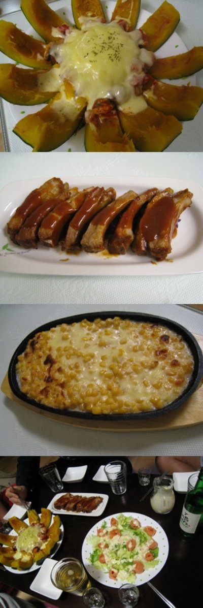 단호박해물찜과 연어샐러드. 등갈비. 콘샐러드