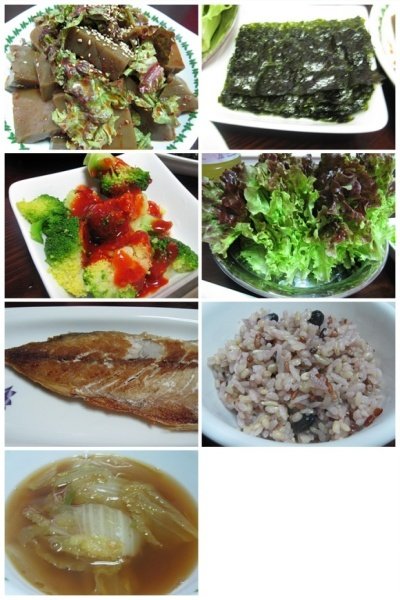 도토리묵,배추된장국,상추쌈, 고등어구이, 브로콜리. 평범한 저녁상